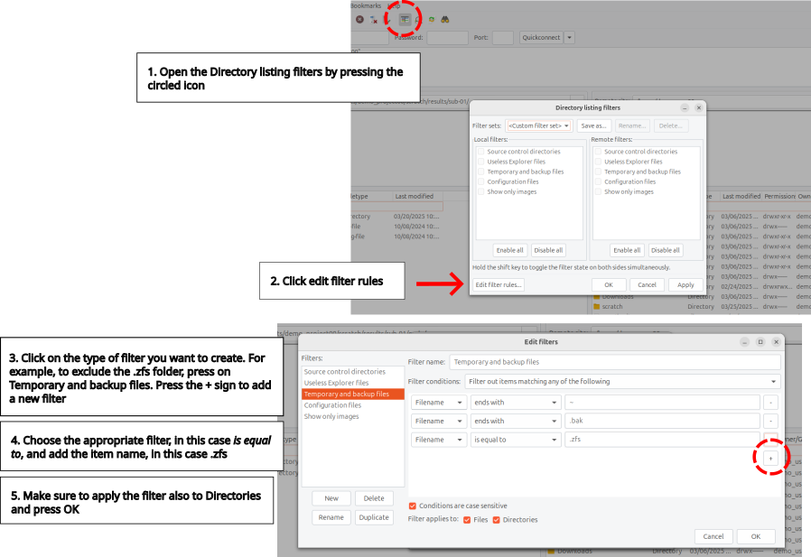 As we explain in the backup section, every project contains a hidden folder called .zfs. The .zfs folder stores temporary snapshots of your project to facilitate the recovery of lost data. Make sure to exclude this folder when transferring your data. In the following sections we explain how to conveniently exclude any file or directory during data transfer using either the command line or Filezilla.